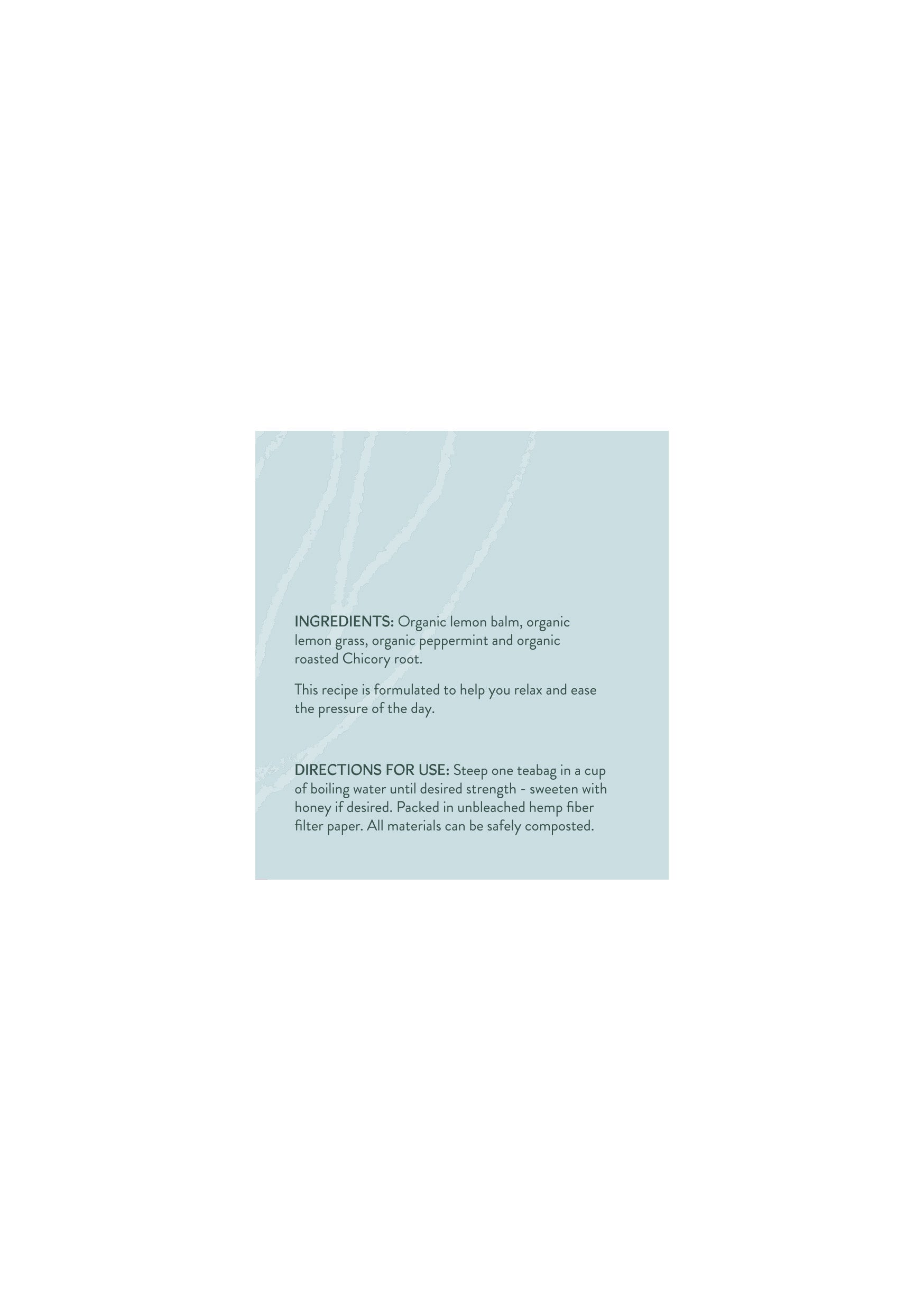 Ingredients: Organic Lemon Balm, Organic Lemon Grass, Organic Peppermint, Organic Roasted Chicory