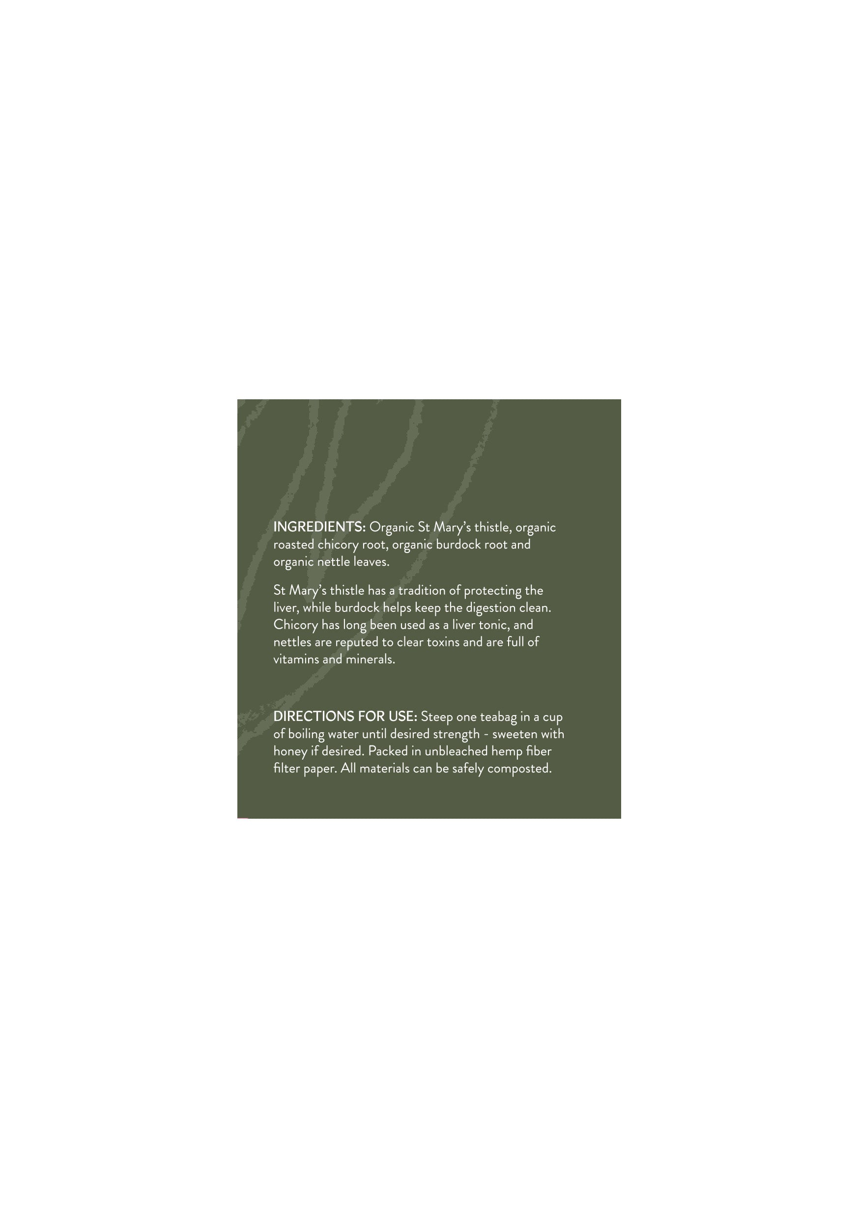 Ingredients: Organic St. Mary Thistle, Organic Rhubarb Root, Organic Chicory, Organic Burdock, Organic Nettles