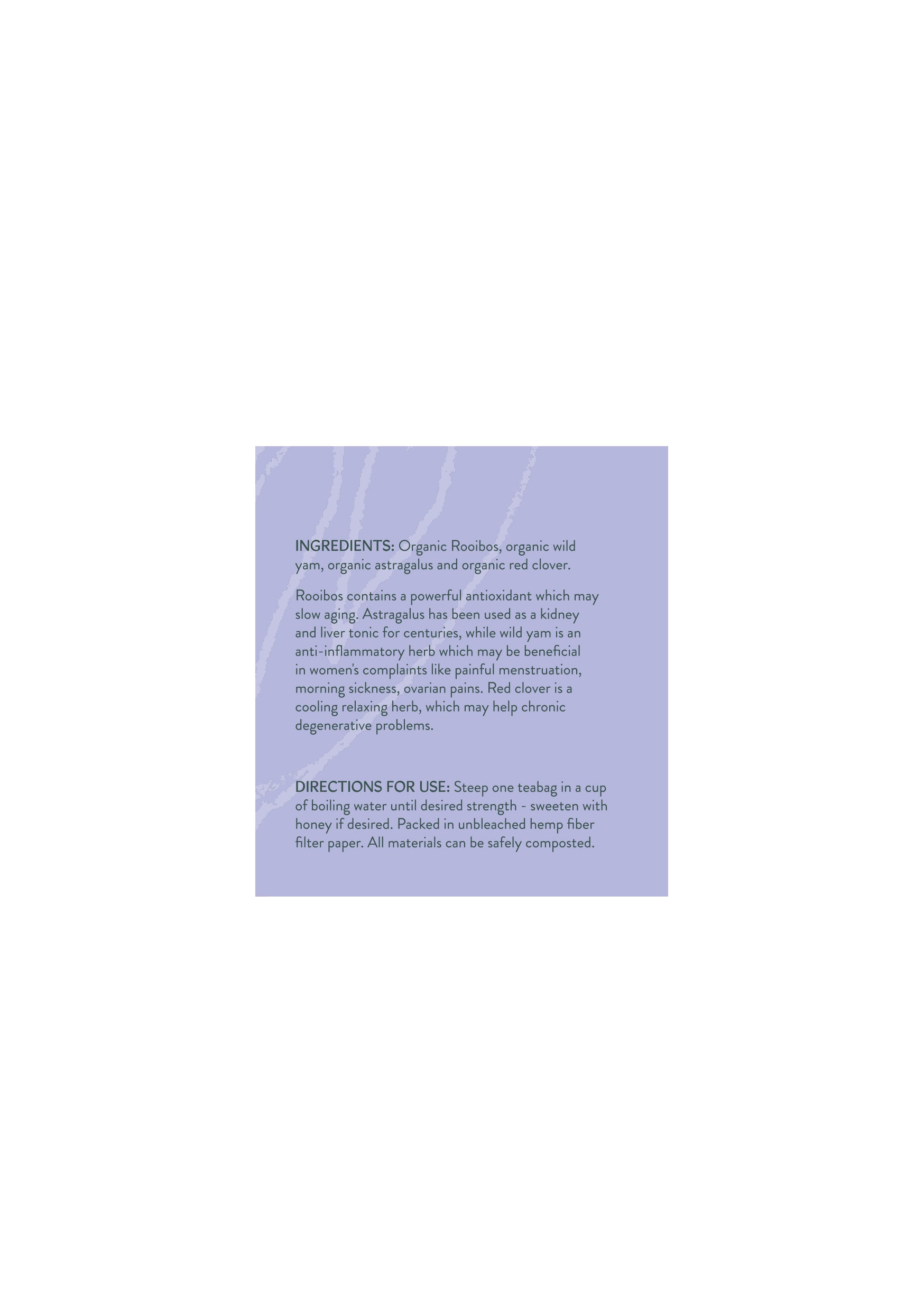 Ingredients: Organic Rooibos, Organic Red Clover, Organic Astragalus, Organic Wild Yam