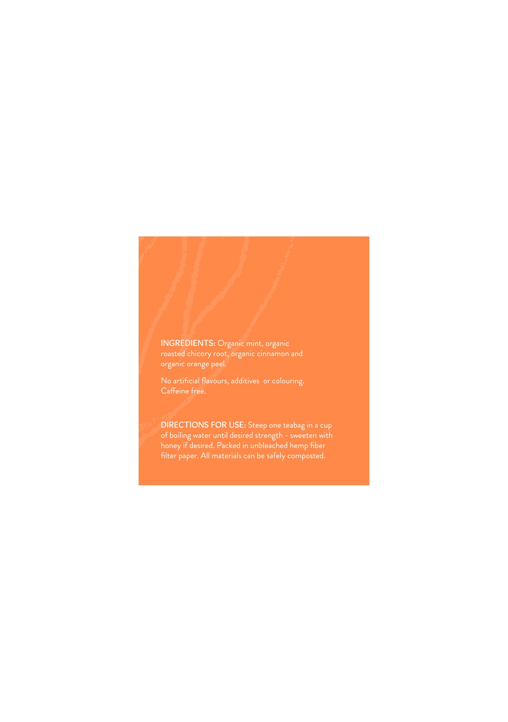 Ingredients: Organic Peppermint, Organic Roasted Chicory, Organic Orange peel, Organic Cinnamon