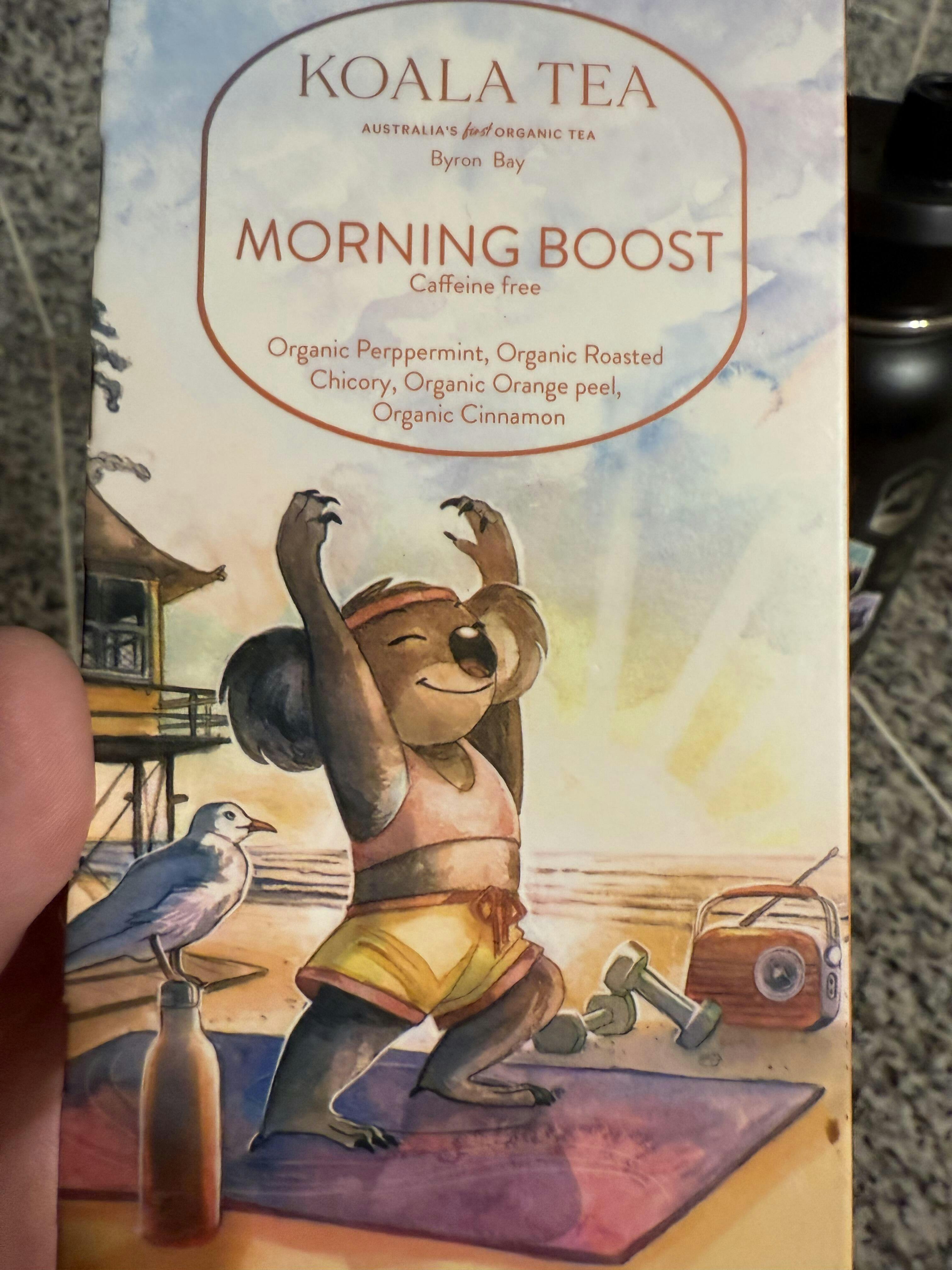 "Morning Boost" provides a vibrant start to your day with its invigorating blend of peppermint, roasted chicory root, cinnamon, and orange peel. This robust combination delivers an energizing kick, making it hard to believe it's entirely caffeine-free.