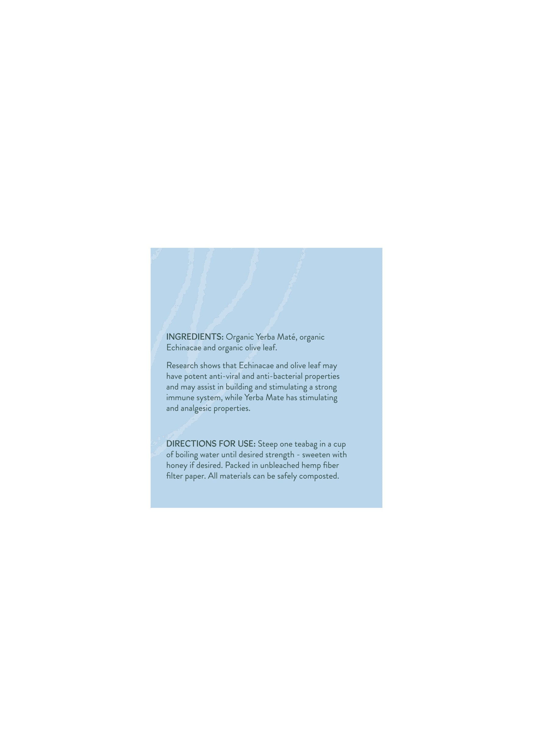 Ingredients: Organic Yerba Mate, Organic Echinacea, Organic Olive Leaf