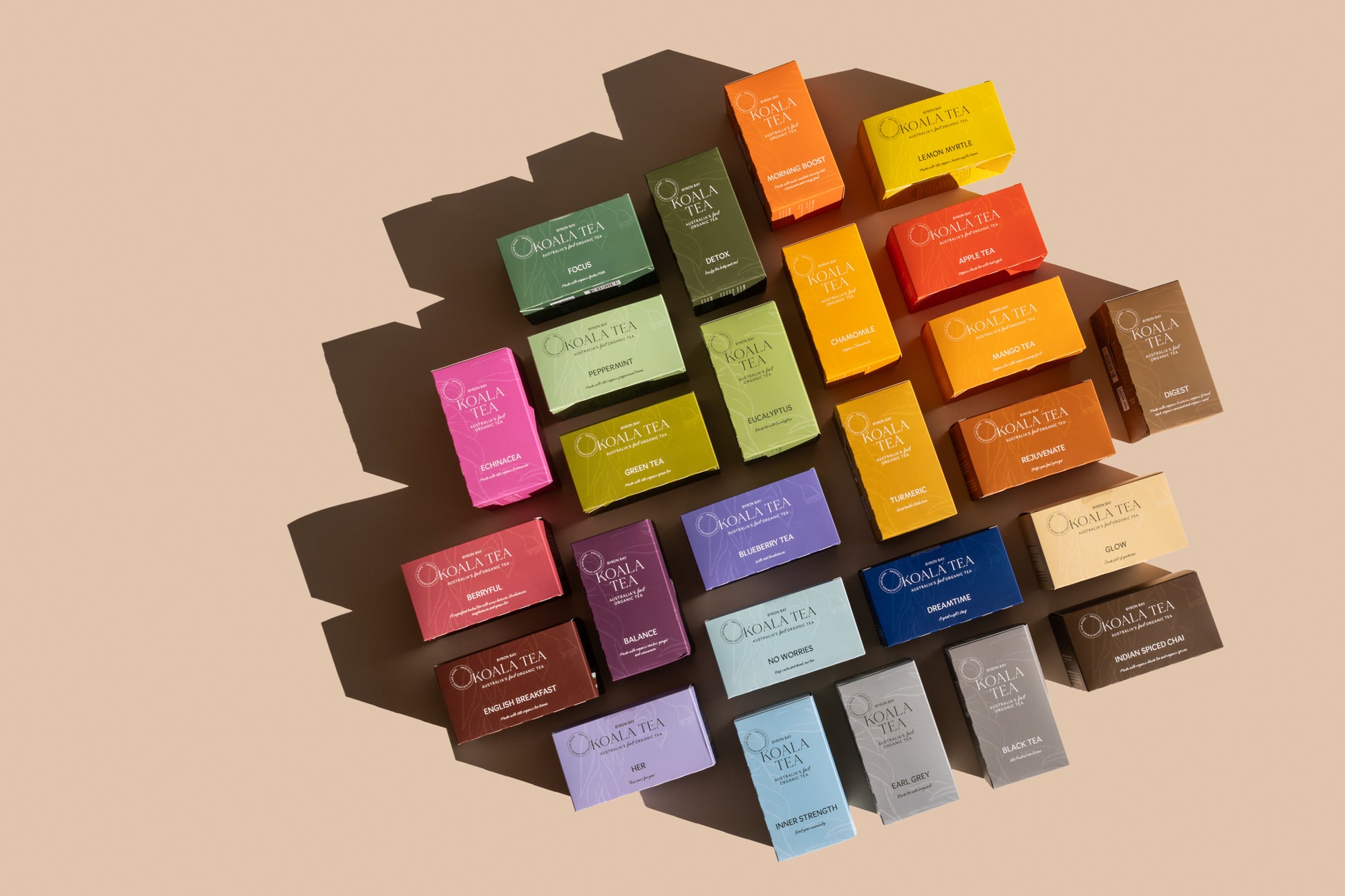 You can choose from: Dreamtime, No Worries, Black Tea, Green Tea, Earl Grey, English Breakfast, Lemon Myrtle, Turmeric, Eucalyptus, Peppermint, Chamomile, Echinacea, Spice Chai, Apple Tea, Blueberry Tea, Mango Tea, Berryful, Digest, Focus, Inner Strength, Glow, Rejuvenate, Detox, Balance, Morning Boost and Her